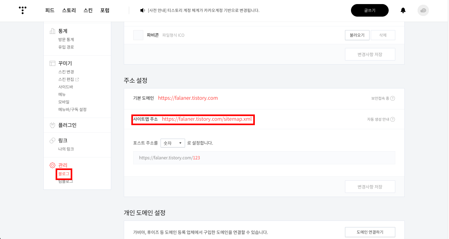 티스토리 관리탭에서 아래쪽 관리 부분에 블로그를 누르면 오른쪽 아래쪽 정보에서 사이트맵 주소가 자동으로 확인된다.