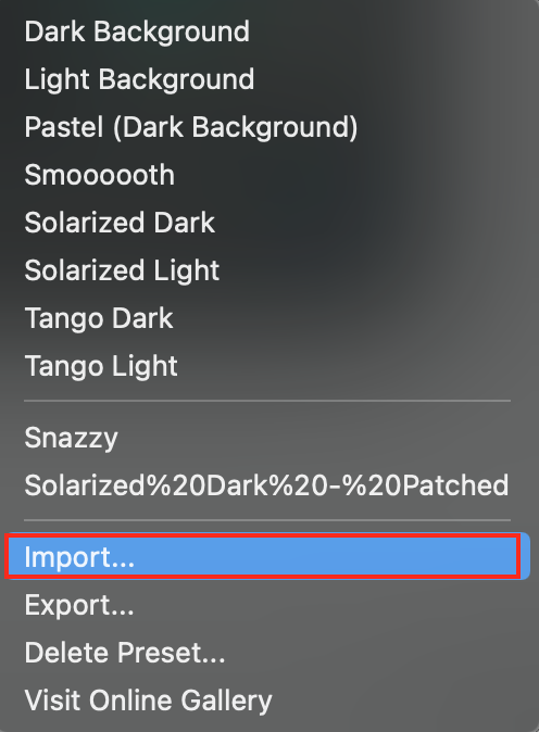 iTerm Themes Intro This is a set of color themes for iTerm (aka iTerm2). Screenshots below and in the screenshots directory. Installation Instructions To install: Launch iTerm 2. Get the latest version at iterm2.com Type CMD+i Navigate to Colors tab Click