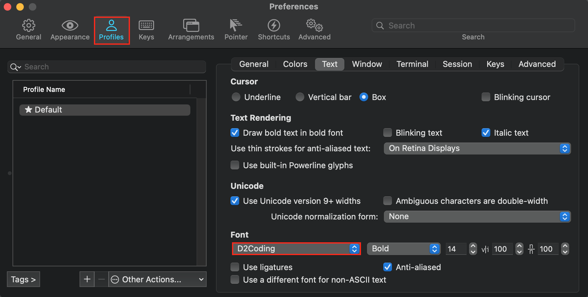 Preferences > Profiles > Font 에서 다운받아 설치한 D2Coding 을 선택한 뒤 에디터를 껐다가 켜 주면 폰트가 적용이 됩니다.
