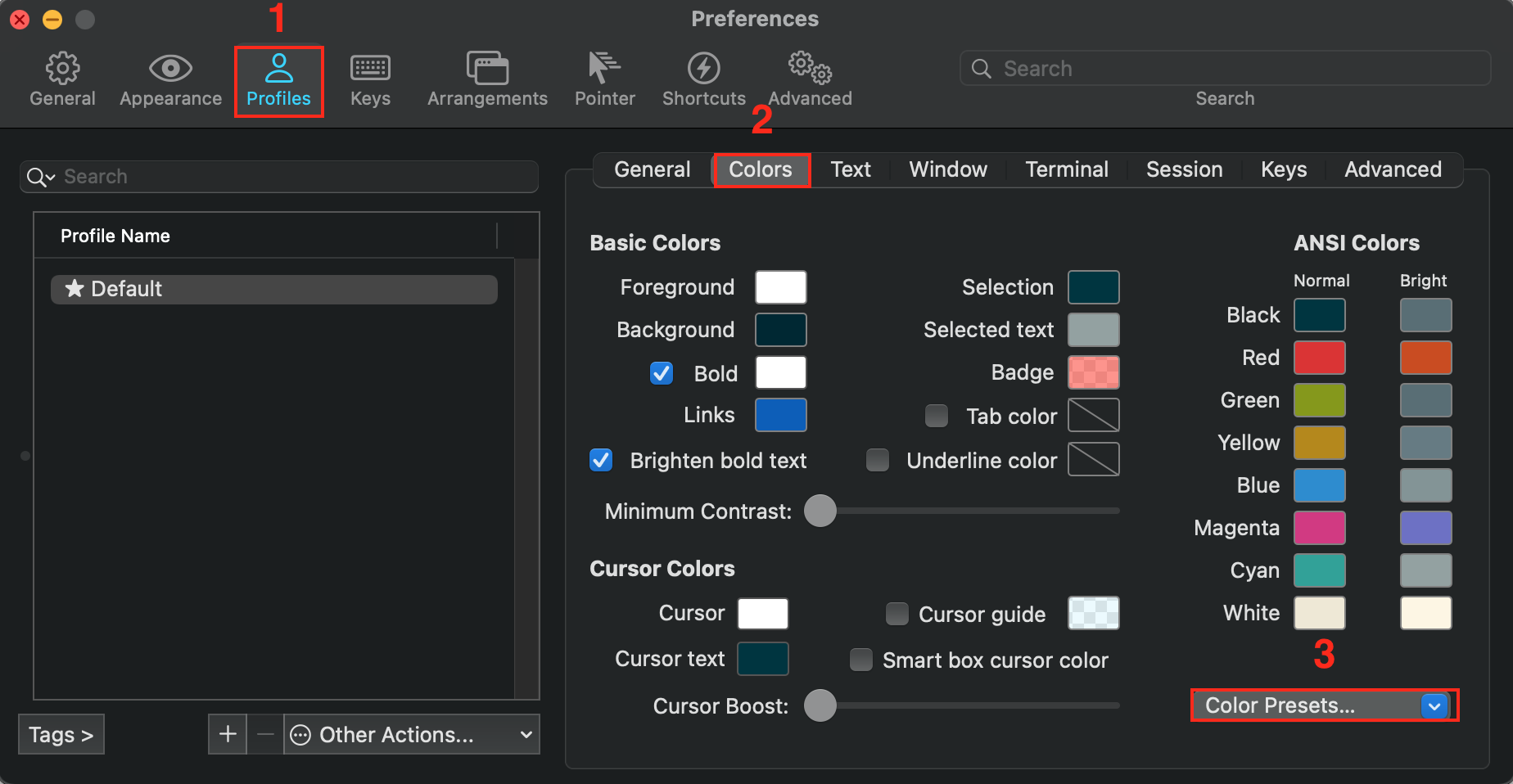 Preferences > Profiles > Colors > Color Presets 를 선택해 줍니다.