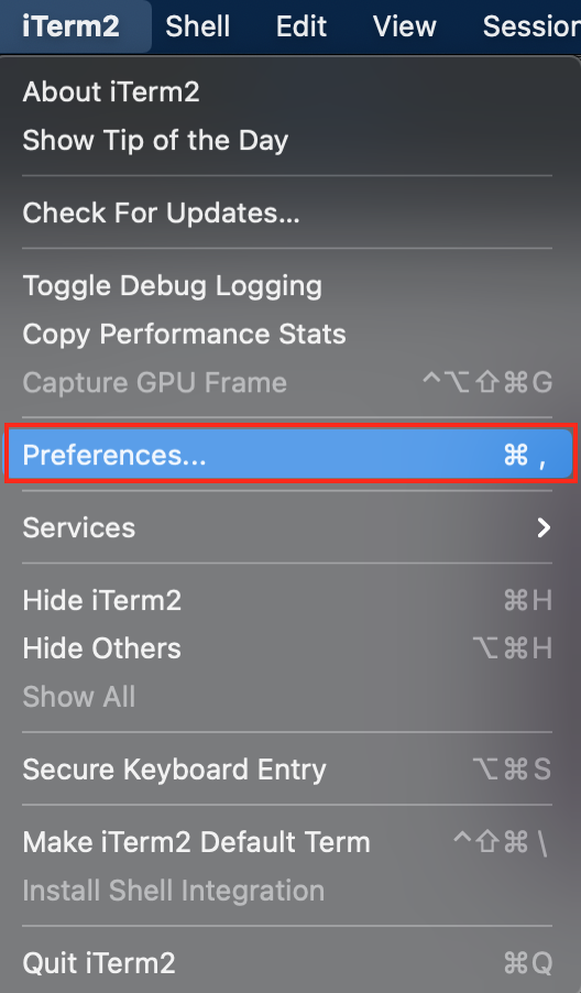 iTerm2 실행 후 Preferences 를 눌러서 실행합니다.