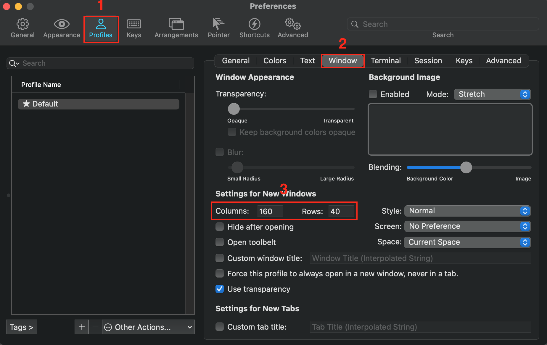 Profiles > Window > Column(가로폭), Rows(세로폭) 조절하시면 됩니다.